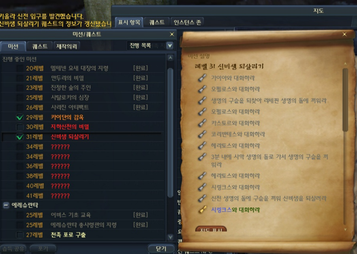 천족 엘테넨 퀘스트인대 생명의돌은