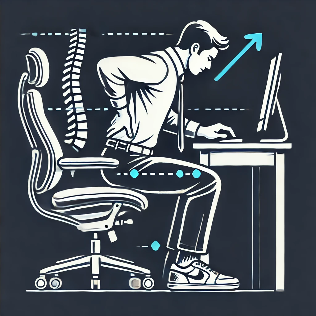 - 잘못된 자세: 장시간 앉아 있거나 구부정한 자세는 요추의 정상적인 곡선을 사라지게 해 허리 뒤쪽으로 통증을 유발합니다.